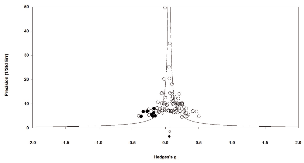 They concluded that this overall result was unlikely to be artifactually inflated by the selective reporting of positive results (the so-called file-drawer effect), calculating that there would have to be 46 unreported studies averaging null results for every reported study in the meta-analysis to reduce the overall significance of the database to chance.