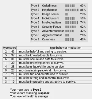 Hmmmm.. Interesting.. very interesting... Took another test which describes the "broody intense sensual minded person who craves security" ish shiz.. and it sounds way more like me... and it shows my Type 4... same as first test... BUT shows my order reversed: SXSPSOTook the test on the link Zen sent me: 126 questions: No clue what it means: